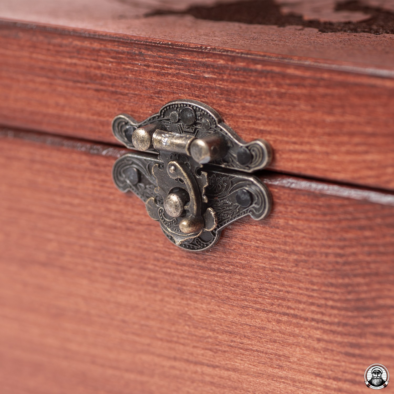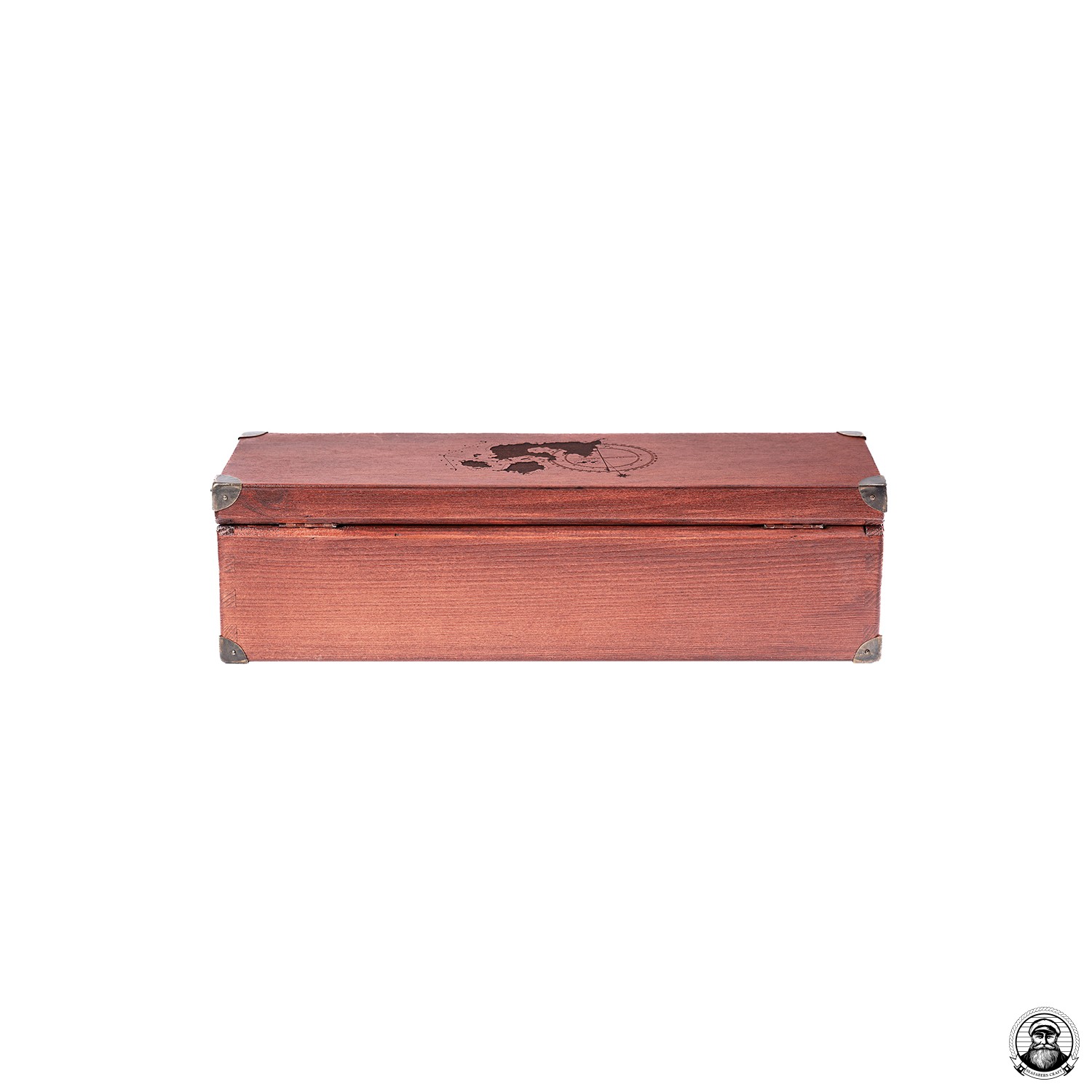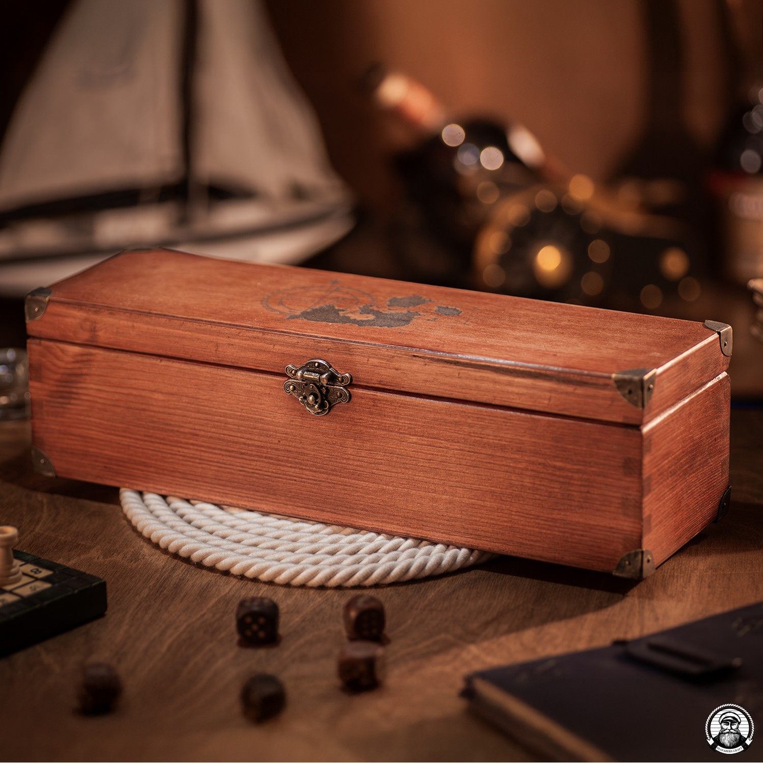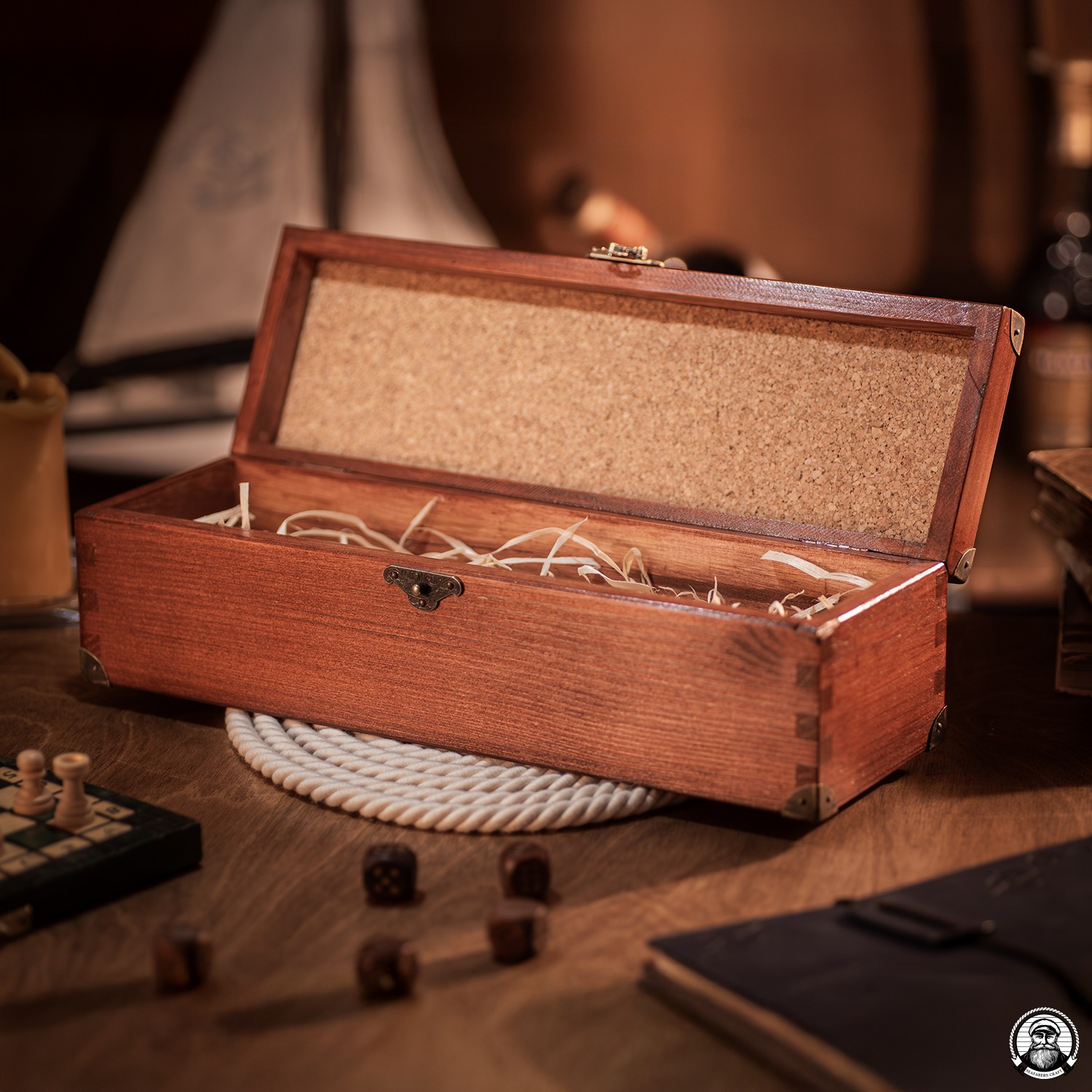 Każda z naszych skrzynek, wykonana z drewna o głębokim, ciemnym odcieniu, jest opowieścią o ręcznym rzemiośle, precyzji i pasji tworzenia. To harmonijne połączenie elegancji vintage z marynistycznym stylem – naturalne drewno, połyskujące metalowe okucia i delikatne grawery, które zabierają Cię w podróż pełną wspomnień i przygód.